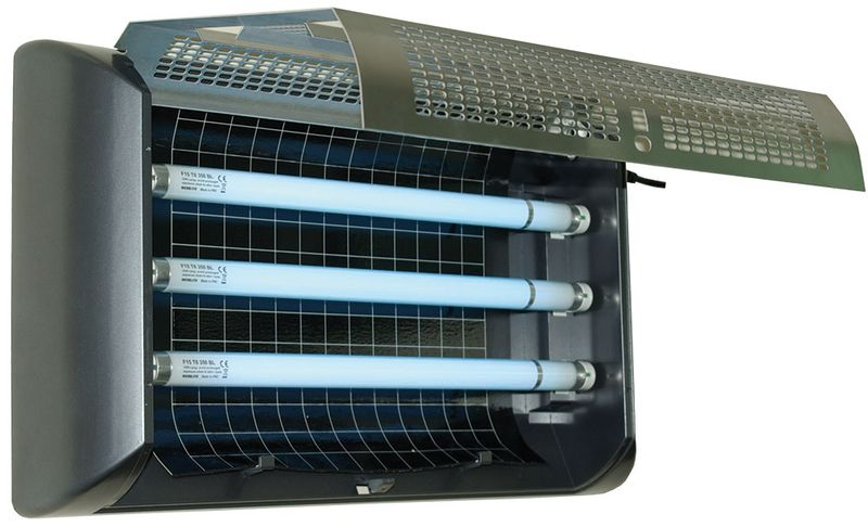 Moderne Insektenlampe im Fly-Killer-Design, korrosionsbeständige Edelstahl Frontpartie, flimmerfreie Technologie-sofortige Inbetriebnahme ohne Starter-für maximale Anziehungskraft mit hochintensiven 15W 18" bruchsicheren Qualitäts-Lampen als Standard - angeboten werden Modelle mit 2 oder 3 Lampenversionen mit serienmäßig bruchsicheren Lampen. Eine IP65-zertifizierte Einheit vervollständigt das Sortiment - die ideale zeitgemäße Alternative zur Elektrogitter-Fliegenfalle.