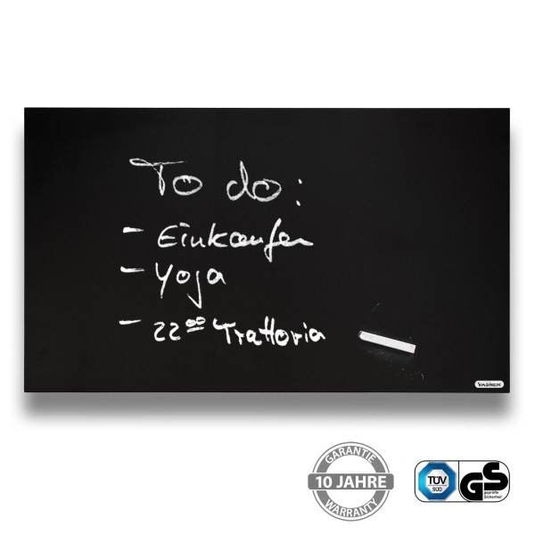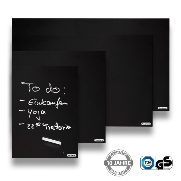 VASNER Citara Tafel Infrarotheizungen sind sehr flach (25mm), sehr robust, sehr widerstandsfähig und mit einer speziellen Oberflächenbeschichtung in Schwarz gefertigt und lässt sich wie eine herkömmliche Wandtafel mit Kreide beschreiben und bemalen. Jederzeit können Sie mit einem feuchten Tuch oder Schwamm die Kreide abwischen. Hängen Sie die Wärmequelle in der Küche oder im Büro auf, um eine Einkaufsliste oder To-Do Liste festzuhalten, während Sie gleichzeitig die angenehme Infrarotstrahlung spüren.