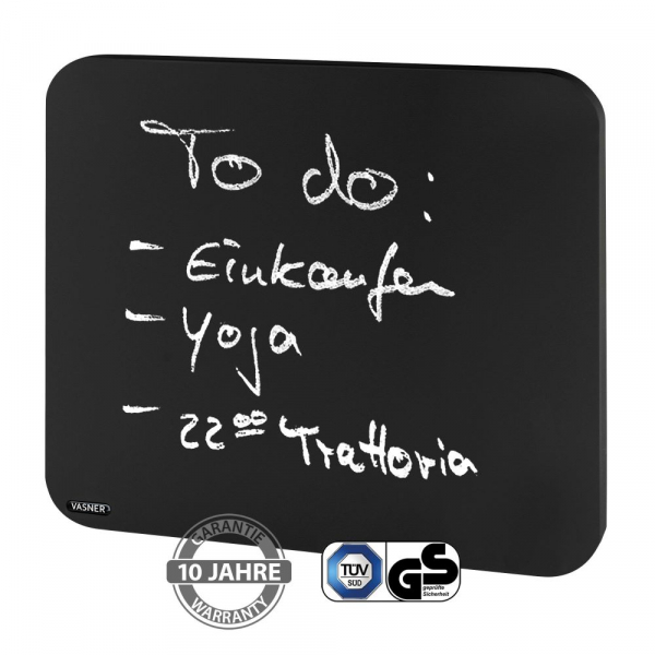VASNER Citara Tafel Infrarotheizungen sind sehr flach (25mm), sehr robust, sehr widerstandsfähig und mit einer speziellen Oberflächenbeschichtung in Schwarz gefertigt und lässt sich wie eine herkömmliche Wandtafel mit Kreide beschreiben und bemalen. Jederzeit können Sie mit einem feuchten Tuch oder Schwamm die Kreide abwischen. Hängen Sie die Wärmequelle in der Küche oder im Büro auf, um eine Einkaufsliste oder To-Do Liste festzuhalten, während Sie gleichzeitig die angenehme Infrarotstrahlung spüren.